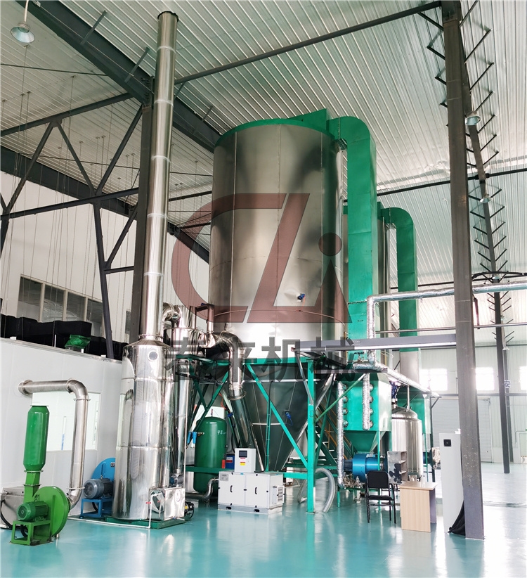 空氣經過濾和加熱,進入干燥器頂部空氣分配器,熱空氣呈螺旋狀均勻地進入干燥室。料液經塔體頂部的高速離心霧化器,(旋轉)噴霧成極細微的霧狀液珠,與熱空氣并流接觸在極短的時間內可干燥為成品。成品連續地由干燥塔底部和旋風分離器中輸出,廢氣由風機排空。