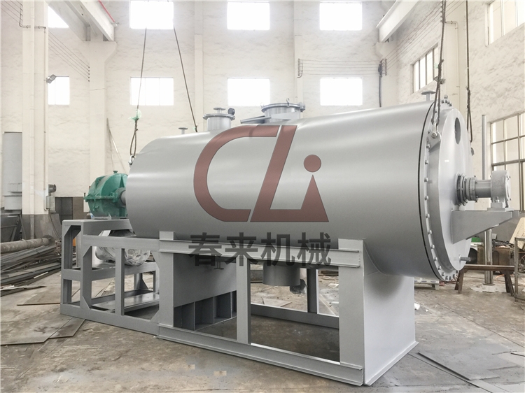 本機(jī)是一種新穎臥式間歇式真空干燥設(shè)備,濕物料經(jīng)傳導(dǎo)蒸發(fā),帶有刮板攪拌器不斷清除熱面上的物料,并在容器內(nèi)推移形成循環(huán)流,水份蒸發(fā)后由真空泵抽出。